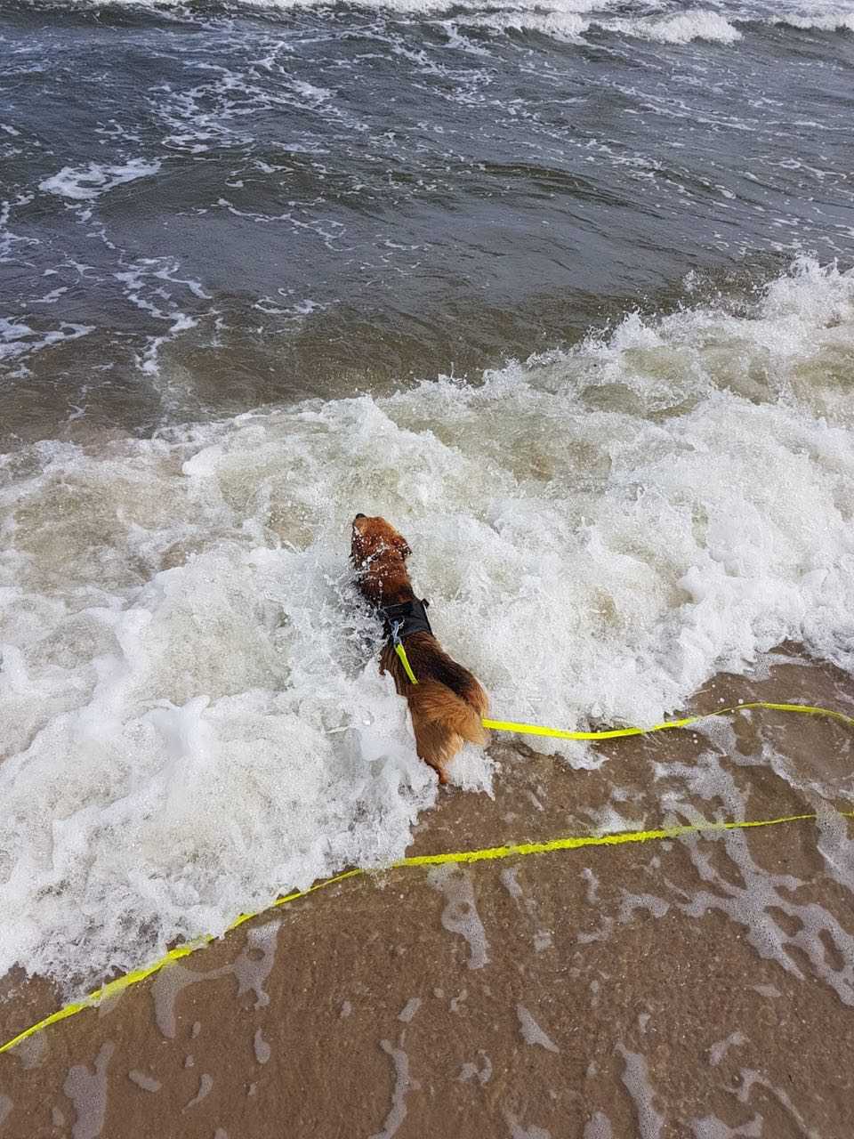 Die Wellen können nicht groß genug sein. Er bellt die an und beißt rein. Dabei vergisst er alles um sich rum.