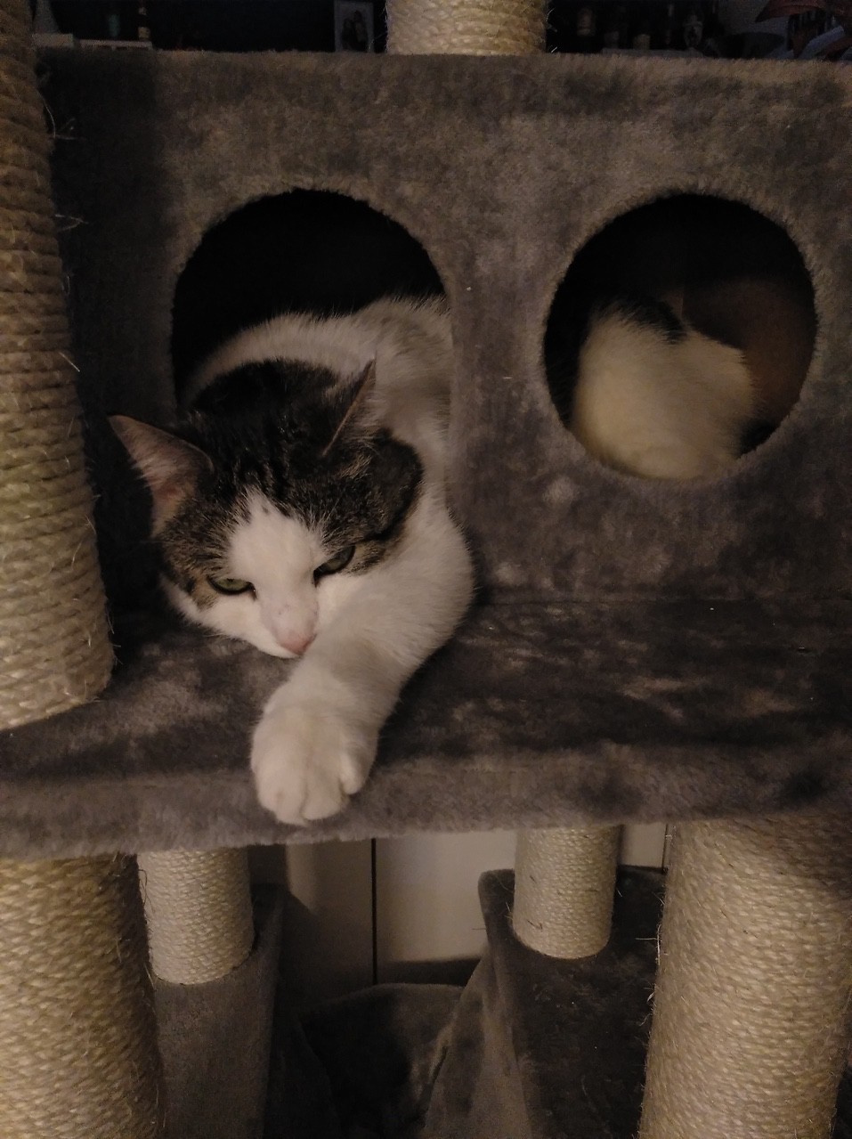 Beide gehen Besuchern aus dem Weg, die täglichen Dosenöffner sind jedoch gerne gesehen und werden regelmäßig gekuschelt. Manchmal spielen die zwei miteinander, oder gucken zusammen aus dem Fenster, meistens halten sie sich aber in verschiedenen Ecken auf. Einig sind sie sich auch in der Essenswahl, Rind bleibt liegen, Hühnchen wird schnellstmöglich verspeist.