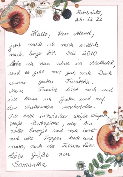 Von Samantha erhielten wir Grüße und freuen uns, dass sie schon so viele schöne Jahre bei ihrer Familie erleben durfte.