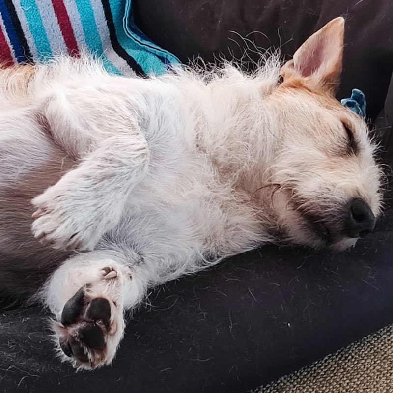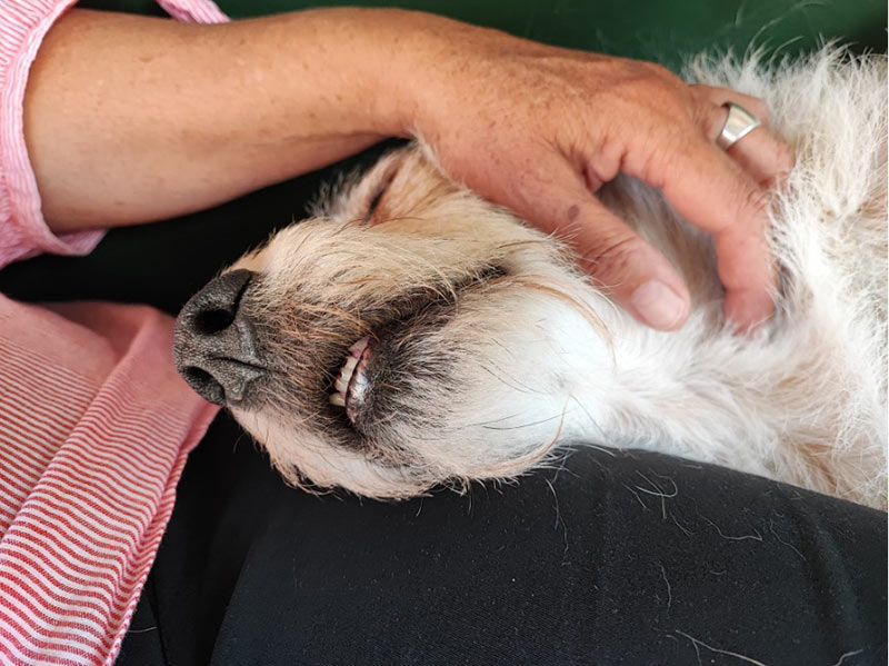 Und natürlich ist er ein großer Schmuser, der gern mit dem Kopf auf unseren Beinen beim Streicheln schläft.