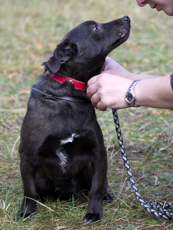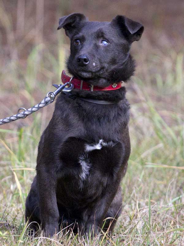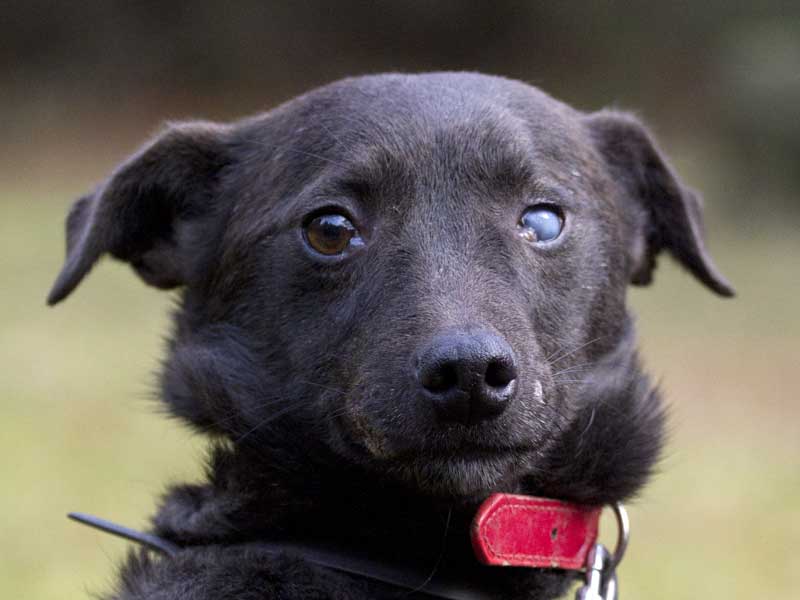 Sobald er die Leine um hat, freut er sich riesig und es kann losgehen. Dabei merkt man ihm nicht an, dass sein linkes Auge getrübt ist und er dort blind ist. Caddy steckt das locker weg und kann damit gut umgehen.