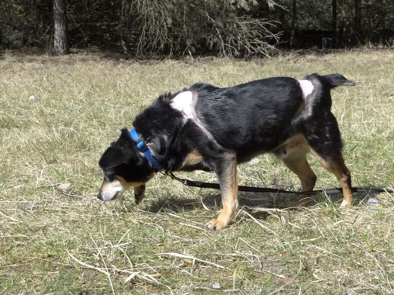 Dazu passen auch die anderen Verletzungen: Auf den Fotos sieht man kahle Hautstellen. Wir haben ein altes Foto gesehen, auf dem man großflächige frische Wunden erkennen kann: offensichtlich hatte jemand mit einem großen Messer versucht, sie im Hals- und Genickbereich bzw. auf dem Rücken zu zerschneiden. Die Wunden damals waren sehr großflächig, sind durch die tierärztliche Behandlung jetzt sehr gut verheilt und auch viel kleiner geworden. Aber die jetzt sichtbaren Stellen werden immer kahl bleiben. Dort muss die Haut auch besonders gepflegt werden.