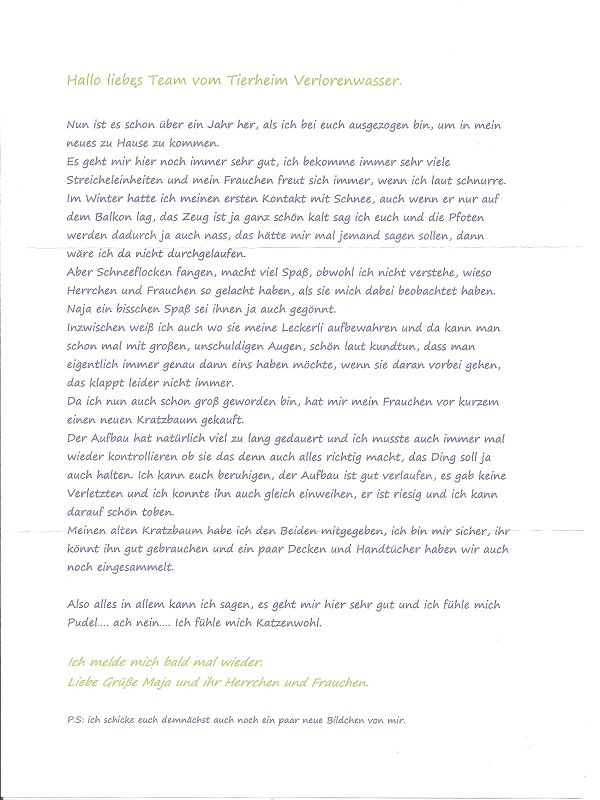 Gestern waren wir bei euch und haben ein paar Dinge mitgebracht, dabei war auch ein kleiner Brief von unserer Katze Maja.