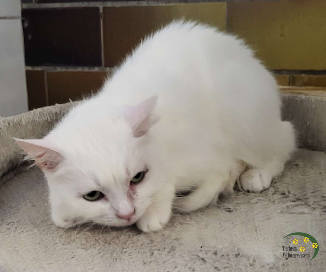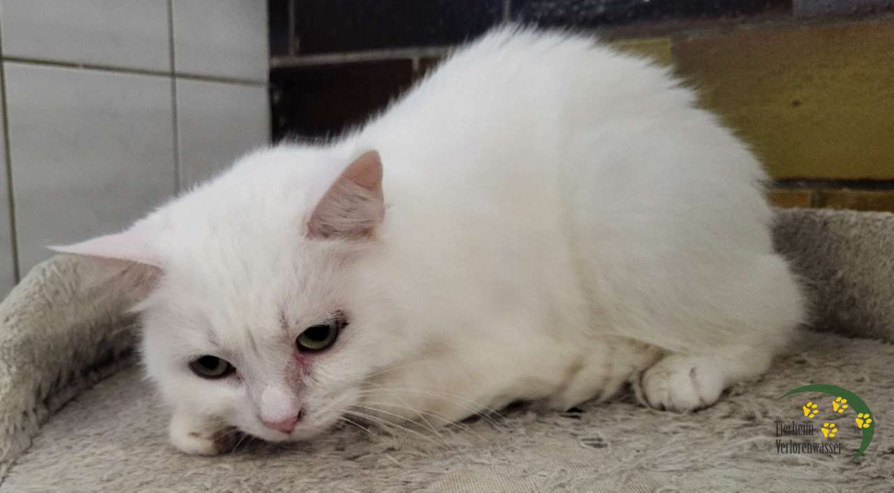Flöckchen wird als seltene weiße Katze sicher ihre Liebhaber finden.
